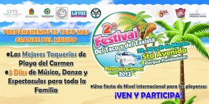 Eventos2º Festival del Taco @ Playa del Carmen Viernes 29 a Domingo 31 de marzo del 2013 – 2º Festival del Taco @ Playa del Carmen – Semana Santa 2013 5a avenida y Parque Fundadores Ver tambiénSegundo Aniversario de Dolores YucaBarPor VivaPlayaEn Eventos Las mejores taquerías de Playa del Carmen3 días de música danza y espectaculos para toda la familia Se preparará el taco más grande del mundo!