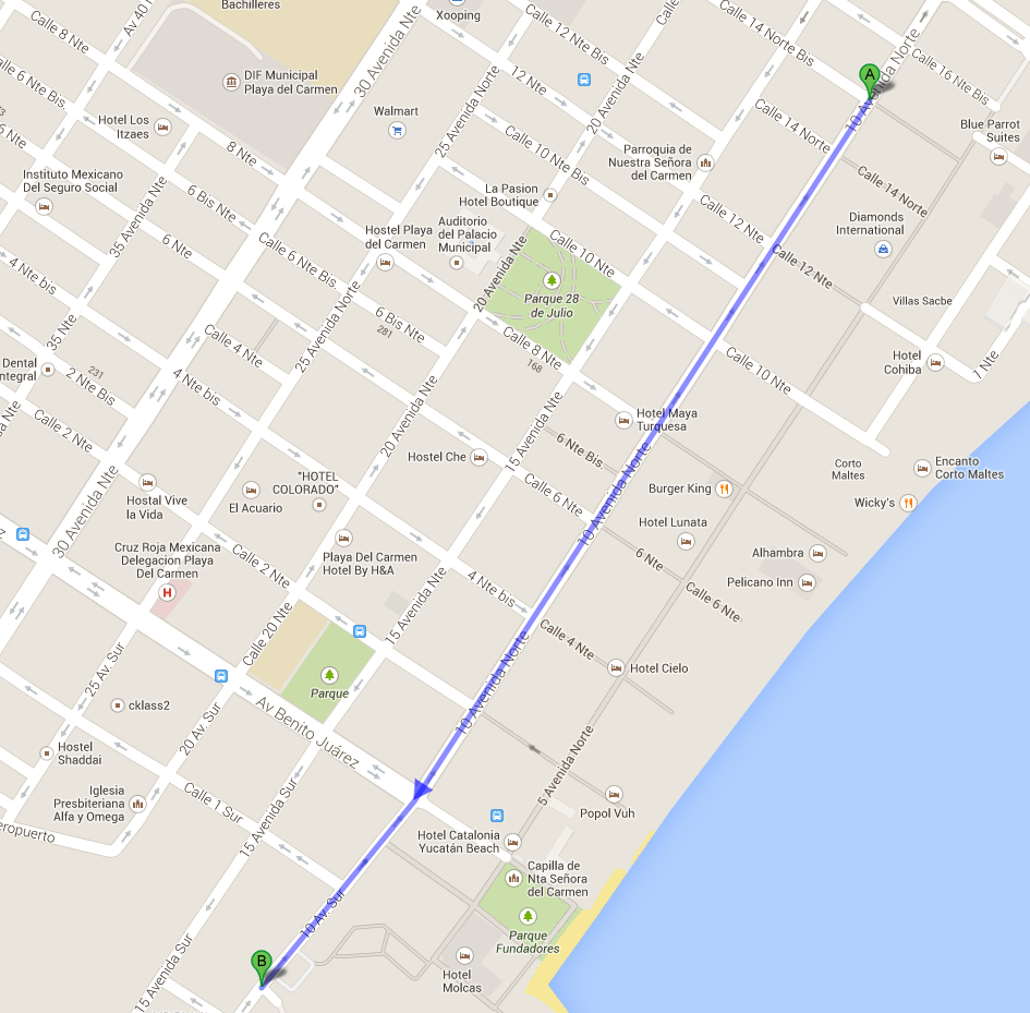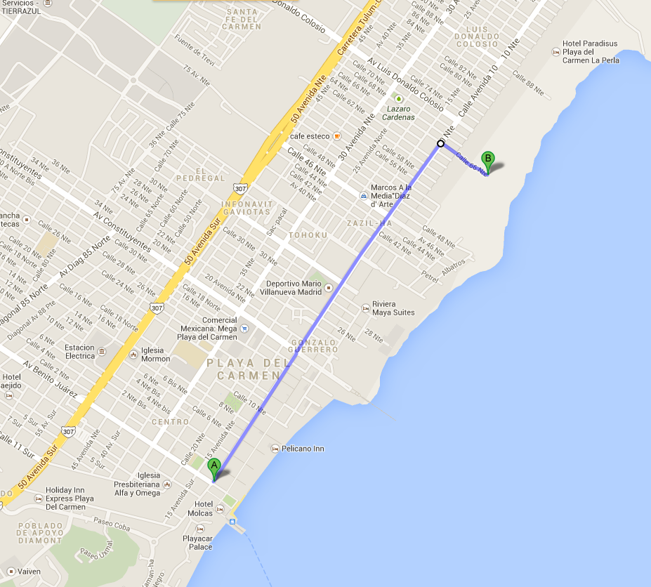 Inicia la ruta sobre la avenida 10 en dirección al Norte hasta encontrarte con la calle 38, ahí doblas a la derecha donde puedes circular en tu bici sobre la 5ta avenida (a partir de la calle 38 pueden circular vehículos) sigue la misma dirección norte hasta encontrarte con la calle CTM, esta zona aun esta en desarrollo ya que se planea la extensión de la quinta avenida hacia esta zona, de ahí tienes la opción de bajar en dirección al mar para terminar tu ruta con un chapuzón, alguna bebida exótica en el extinto Canibal Royal o un masaje en la playa.