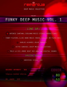 Sábado 6 de julio del 2013Funky Deep Music Vol. 1 @ Reina Roja Line Up: Antonio Santana Funky Players Karlos Alvarez Vitto Sánchez Polo Lavie SPECIAL GUEST……………… BACARDI SMIRNOFF Y TEQUILA CUERVO SPECIAL EN 50 Y SHOTS D DR. JAGER EN$30 **COVER H$ 80 M $50