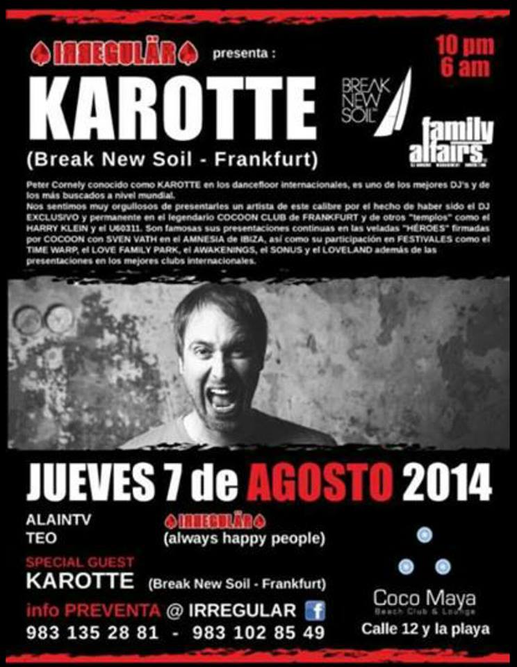 EventosKarotte @ Coco Maya Jueves 7 de agosto del 2014 Karotte (Cocoon) @ Coco Maya – Playa del Carmen 10:00 pm Wam Up: Alantv TeoVer tambiénPaseo en Bici @ Playa del CarmenPor VivaPlayaEn Eventos Seguir a @Viva_Playa